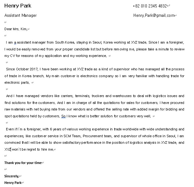외국계 기업은 한국의 기업들처럼 정시 채용이 있는 기업이 없고, 수시 채용이기에 일자리가 날 때마다 많은 양의 이력서를 받지는 않는 편이다. 그래서 우리나라처럼 자소서를 읽어 Cover letter 만 보고, 진짜 이력서는 보지도 않는 경우는 거의 없다. 그렇지만 이력서 이전 최전방에서 인사팀을 맞이 하는 글이고, 이력서에 무슨 내용이 있는지 진액만 담아낸 글이므로 Cover letter의 중요성은 이루 말할 수 없다.