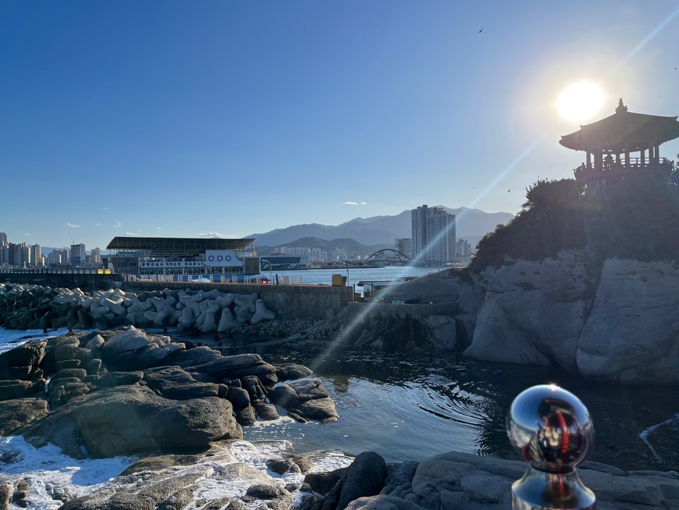 위로 올라오면 동명해교 너머로 영금정이 보입니다. 날씨가 너무 좋아서 정말 그림 같이 사진이 나왔네요. 실제로는 더욱 눈을 뗄 수 없이 아름다운 풍경이었습니다. 하늘과 바다가 구분이 안 될 정도로 너무 청명했습니다.