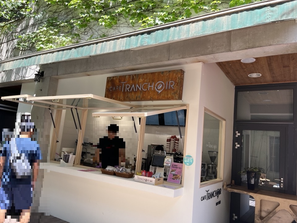 "느티나무 도서관" 지하 1층에서 야외 공간으로 나가면 "카페 뜨랑슈아"가 있어요.