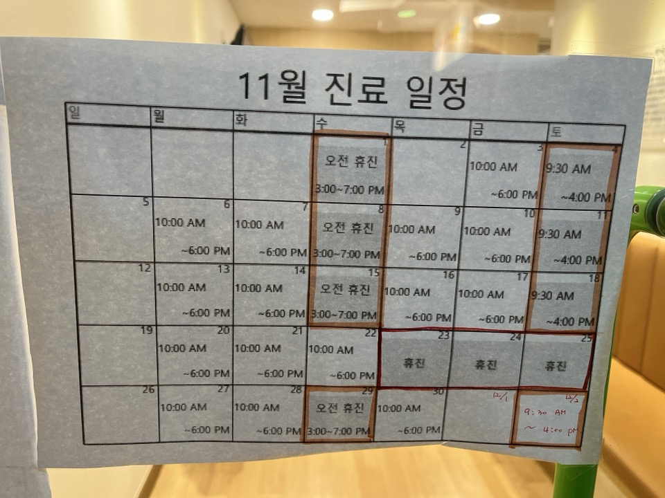 그리고 이번에 가 보니 11월 진료 일정표가 있더라고요.