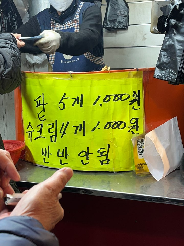 | 원조붕어빵 (팥 붕어빵) - 5개에 1,000원 슈크림 붕어빵 - 4개에 1,000원 (반반 섞어서는 불가) 군고구마 - 5,000원 |