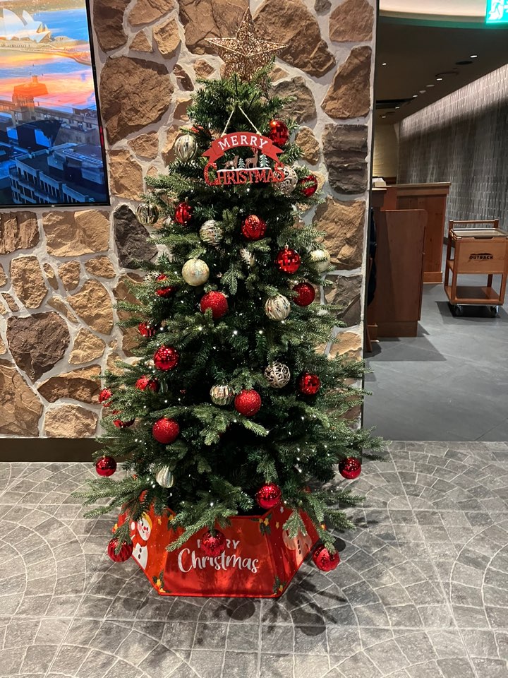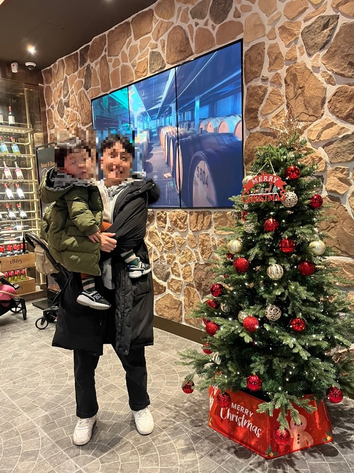 이렇게 싹싹 긁어 먹고 계산을 하러 갔는데 트리가 있어서 하삐 애비랑 하삐 사진 한 장 기념으로 찰칵했어요~