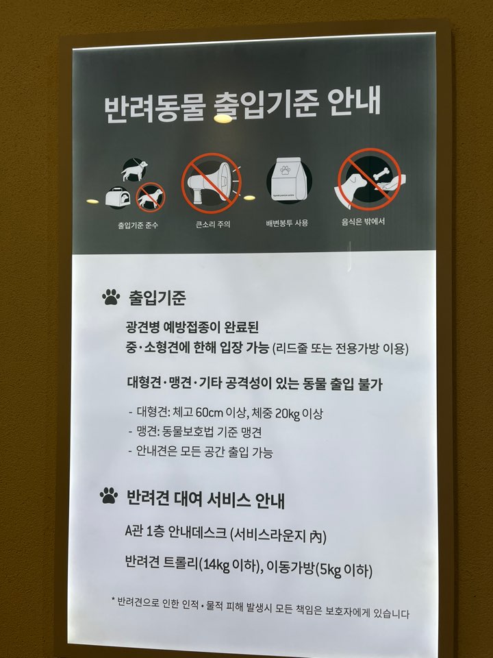 애완 동물은 대형견만 아니면 우선 출입이 가능하다고 보시면 될 것 같고, 자세한 사항은 아래와 같습니다.