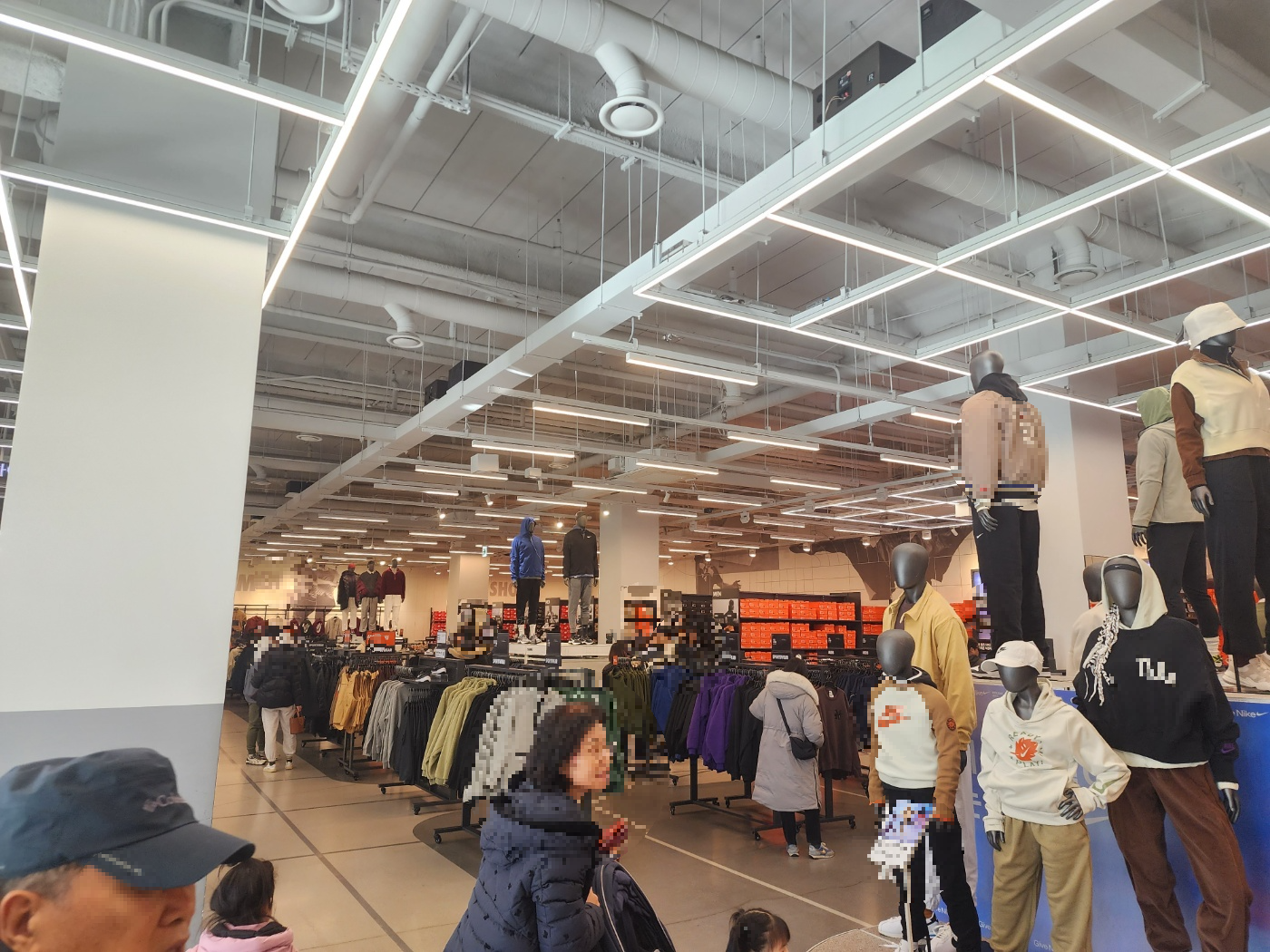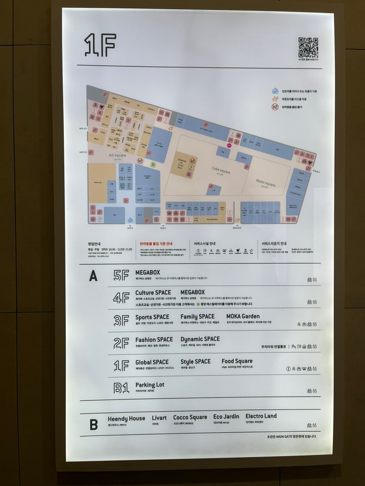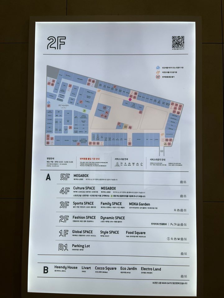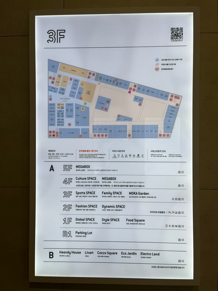 지하 1층에서 엘레베이터를 타시면 1~3층까지가 매장이 있는 층입니다. 1층에 푸드코드가 있고, 아디다스와 나이키 매장이 있지만 3층에도 스포츠, 아웃도어 매장이 있었습니다.4층은 문화센터가 있고, 4, 5층은 메가박스 영화관이 있습니다.