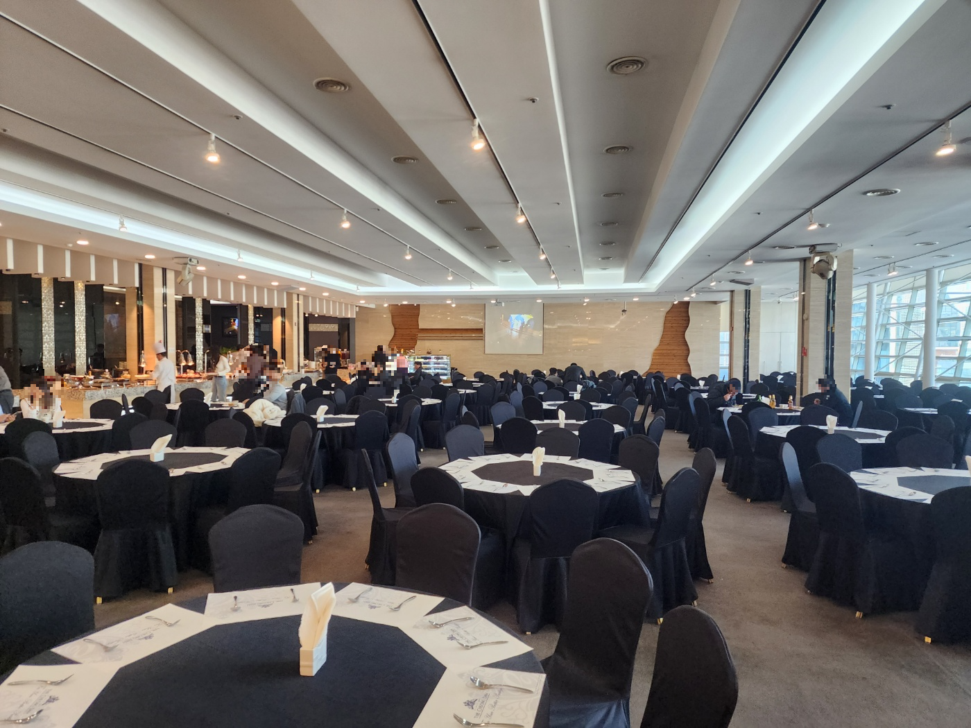 드디어 대망의 뷔페입니다. 뷔페는 3층과 4층 두 개의 층으로 운영되고 있습니다. 10명정도가 앉을 수 있는 원형테이블이 약 20개 정도 있고, 창가쪽에는 약 12인 정도 앉을 수 있는 테이블이 8개 정도 있어 약 300명 정도는 동시에 수용 가능해 보였습니다.