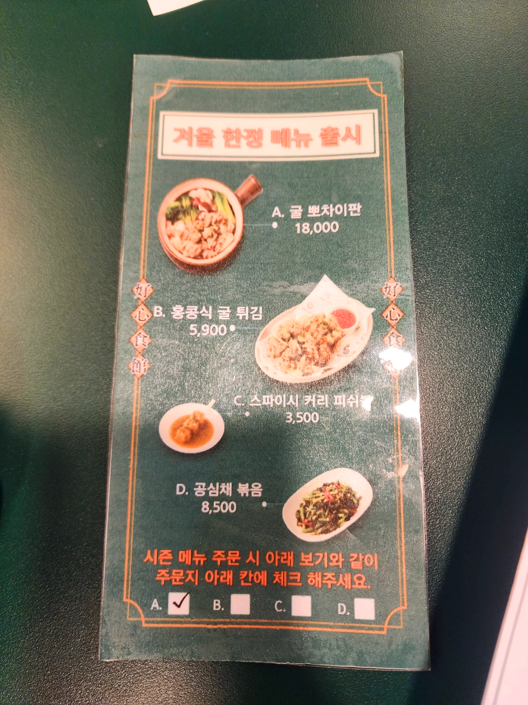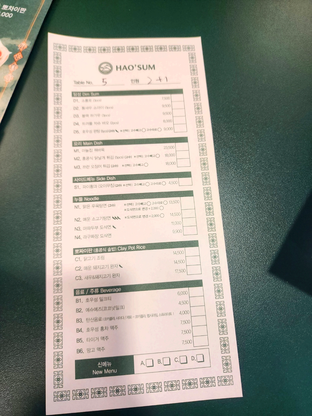 주문은 아래와 같이 별도 메뉴 용지에 표기를 한 후 계산대에 가서 주문하는 선불 방식입니다.