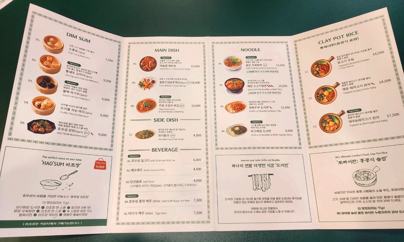 호우섬 메뉴는 딤섬, 면요리, 밥요리(홍콩식 솥밥), 그리고 메인 요리로 나뉩니다. 여기서 가장 인기가 많은 메뉴만 가격을 보면 아래와 같은데요. 가격이 싼 편은 아니고, 양은 적어 가성비가 그리 좋지는 않습니다. 작은 만두 3점에 7,500원이니까요. 실제 홍콩 여행갔을 때도 이렇게 비싸지는 않았는데, 너무 가성비가 떨어지기는 합니다.