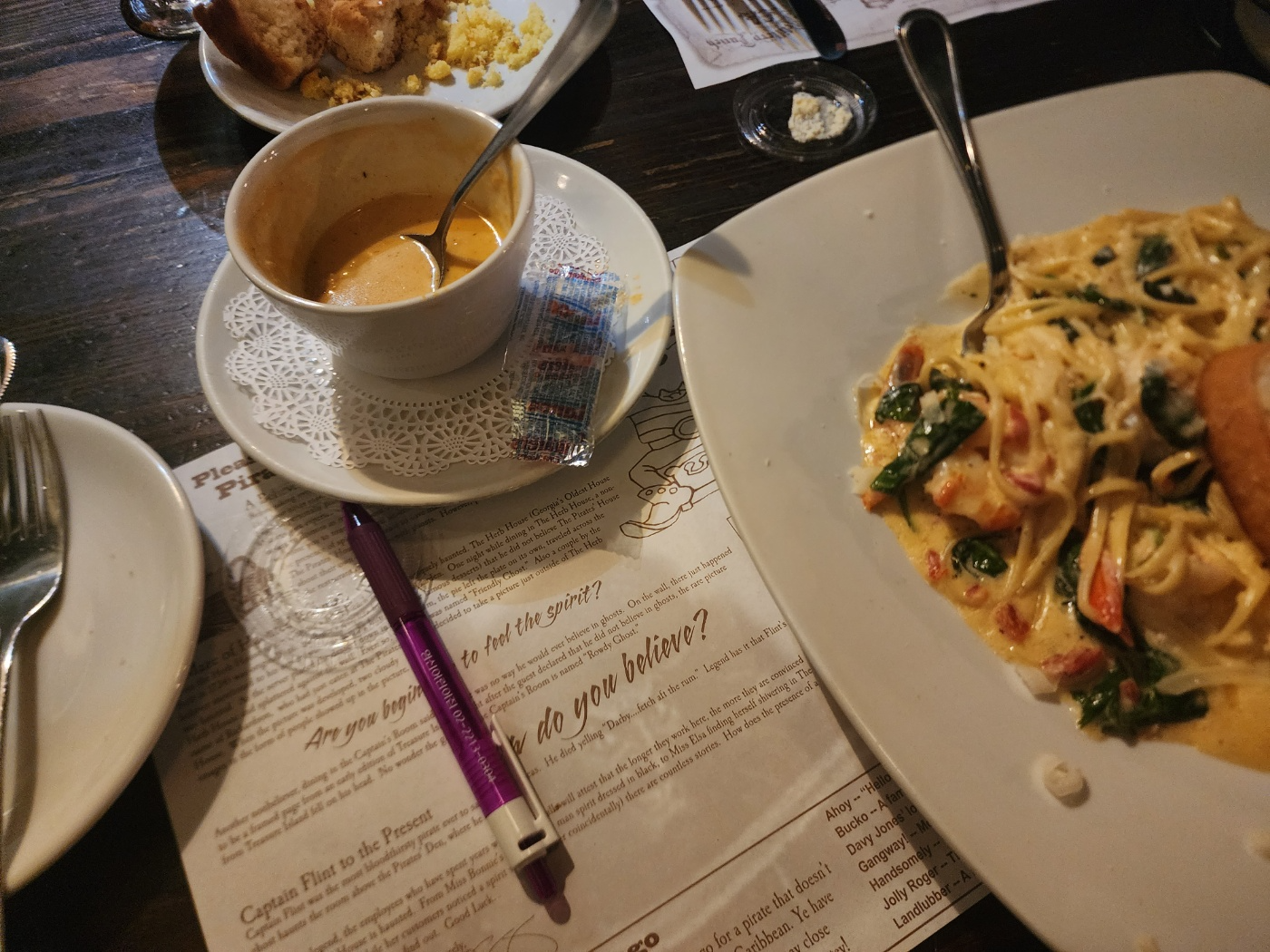 "The Pirates's House" 에 가시면 무조건 새우 요리를 시켜 먹으라고 추천을 하는데 새우 요리는 정말 맛있습니다. 그리고 빵과 비스킷도 정말 맛있었습니다. 다만 파스타는 면은 기가막히게 잘 익혀줬지만 소스와 시금치의 조화가 저는 그렇게 달갑지는 않았습니다.