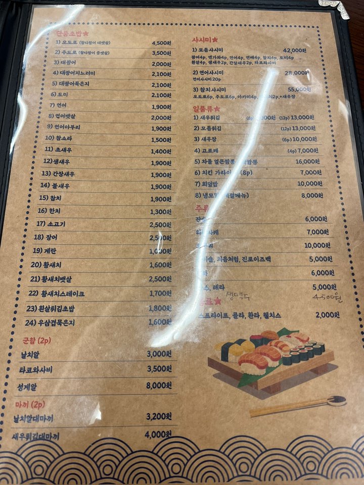 초밥과 사시미 그리고 튀김, 회덮밥 등 다양한 메뉴가 있었어요.