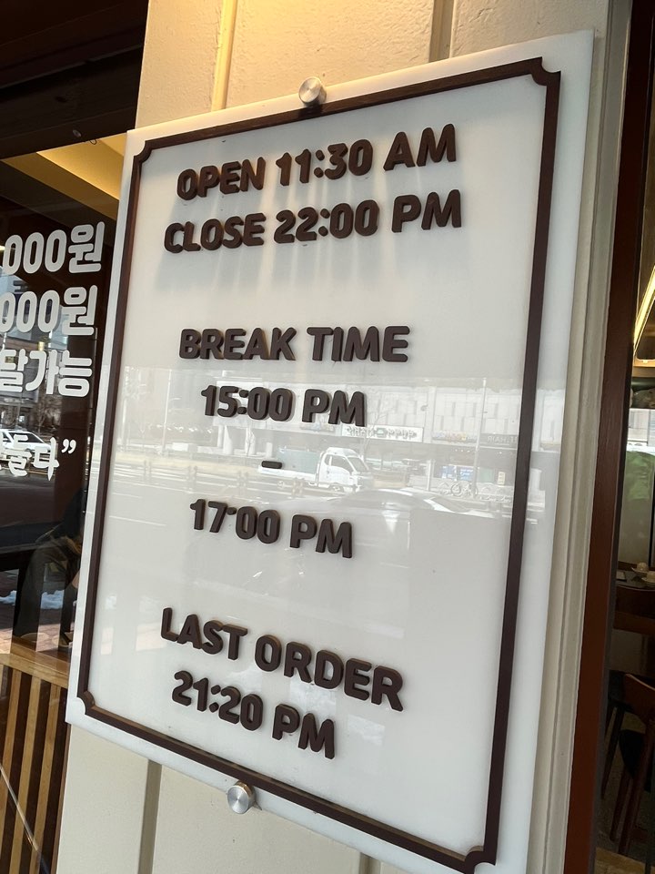 | 매일 오전 11:30 ~ 밤 10:00 쉬는 시간 오후 3:00 ~ 5:00 마지막 주문: 밤 9시 20분 |