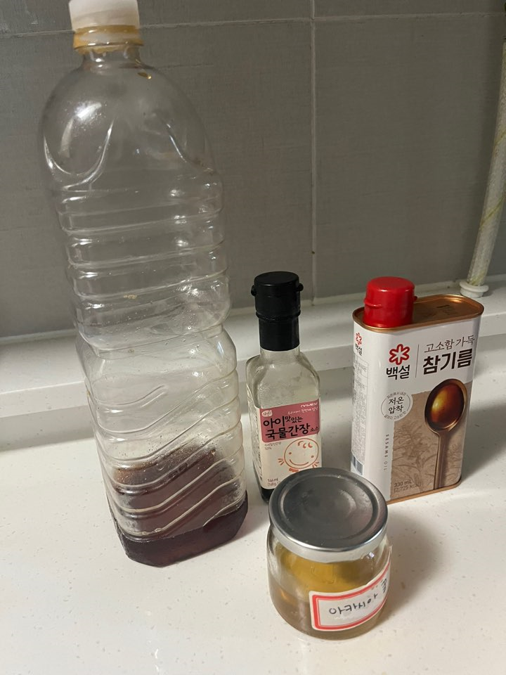 (양조 간장 2스푼, 아기 간장 2스푼, 꿀 3스푼, 매실청 1스푼, 다진 대파, 다진 마늘 1스푼. 참기름 조금)