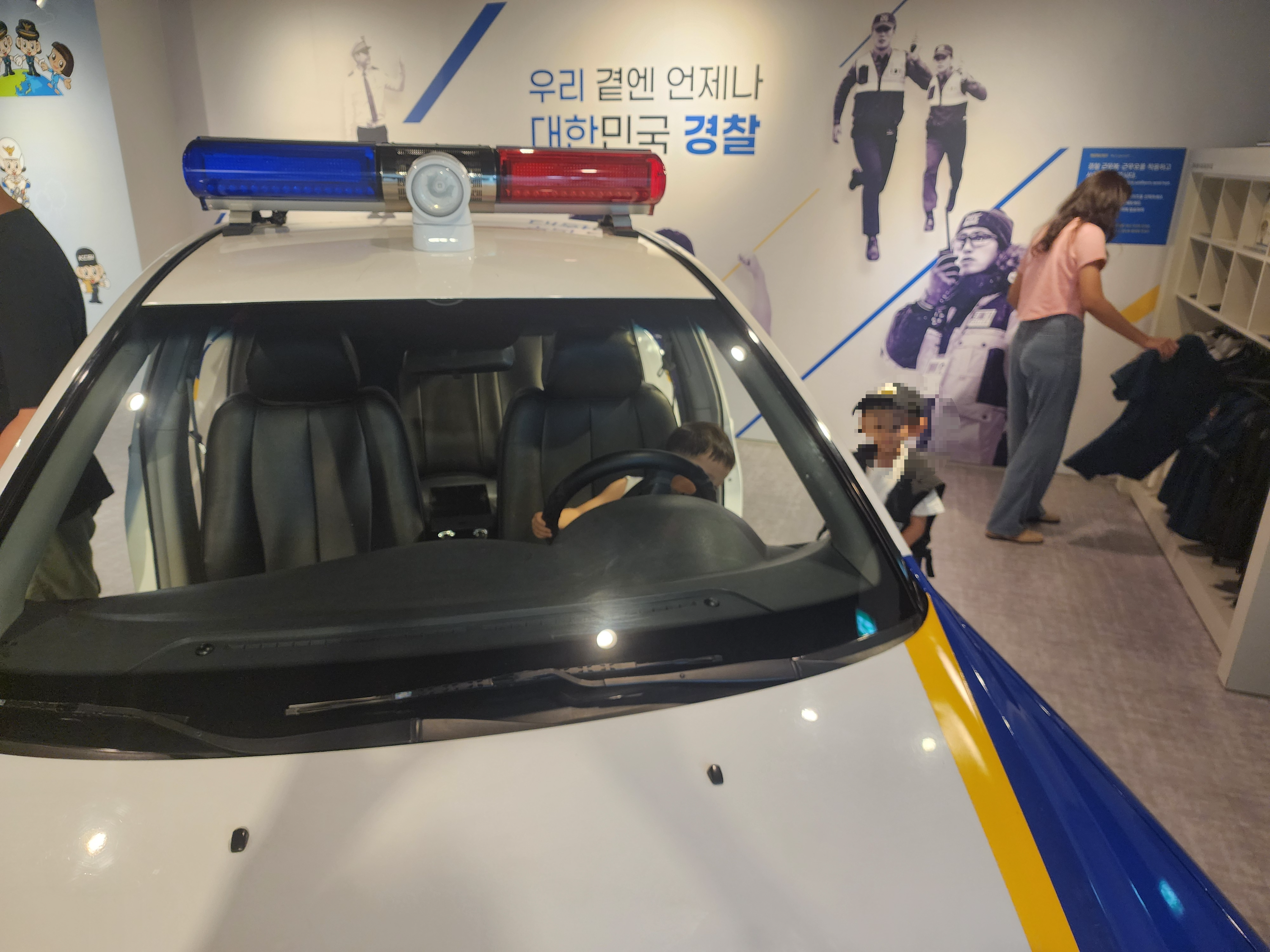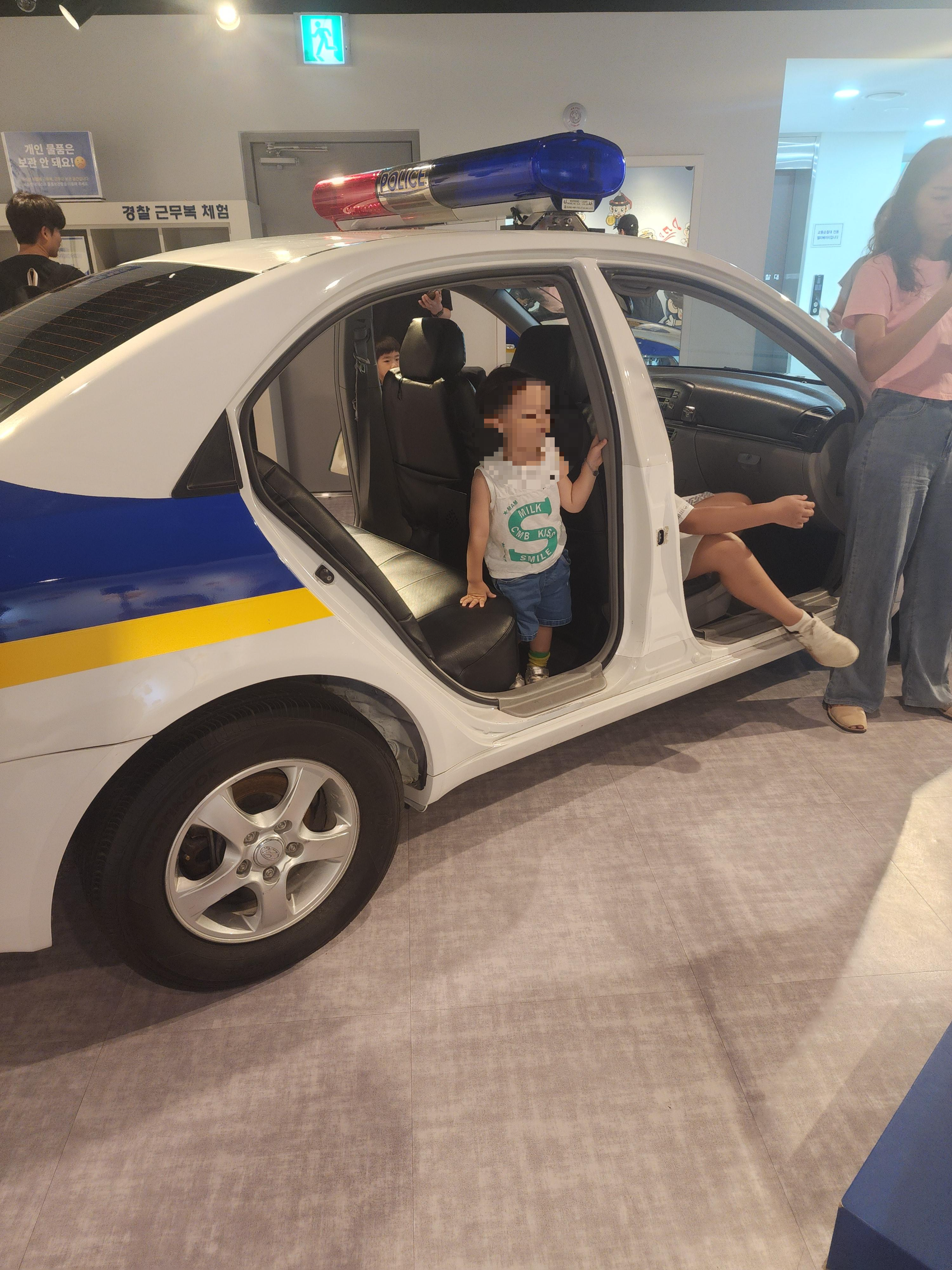 경찰차 안에 들어가서 이것저것 만져보고, 하삐는 싫다고 하며 입지 않았지만 경찰 제복을 입어 볼 수도 있습니다.