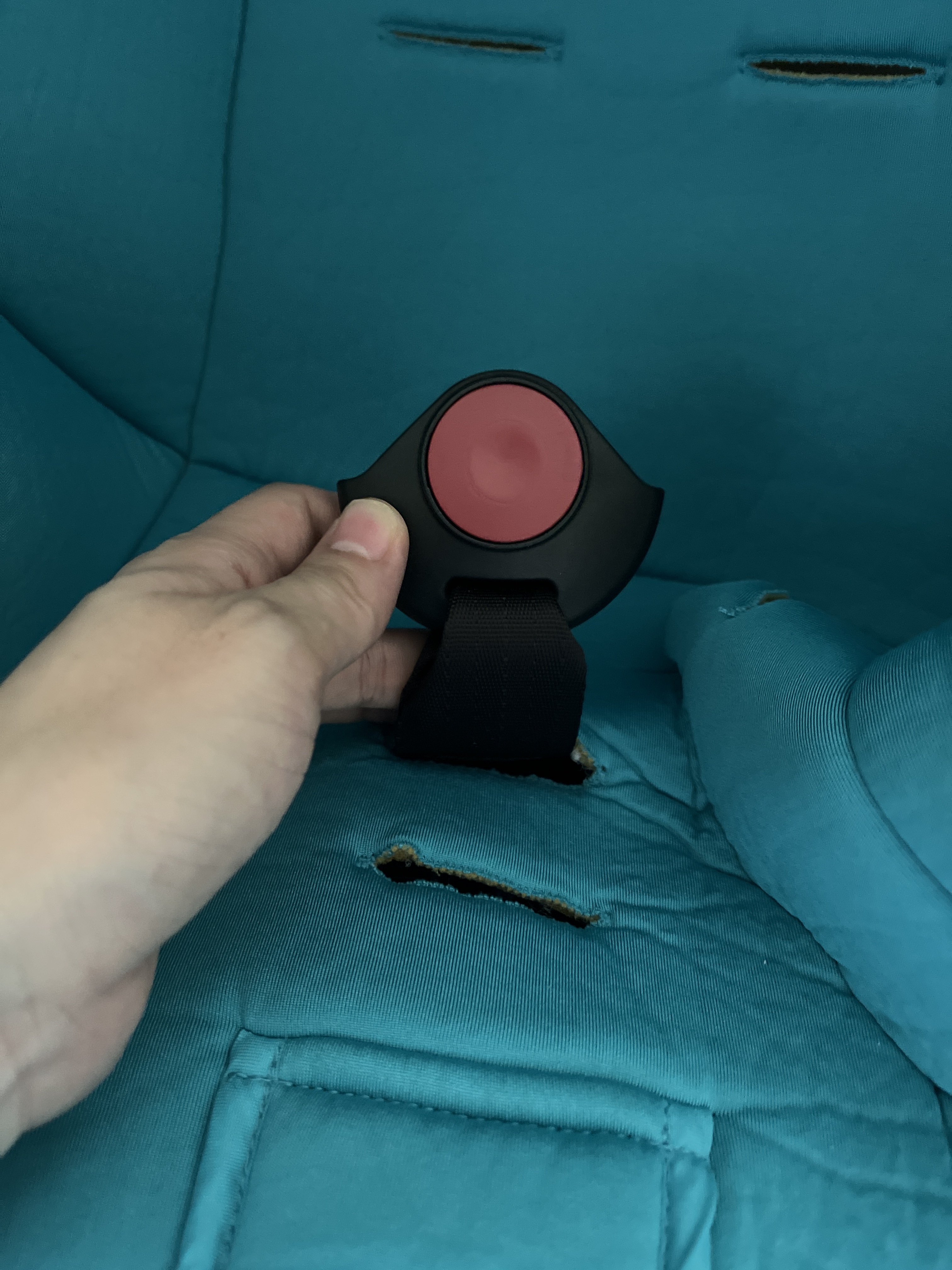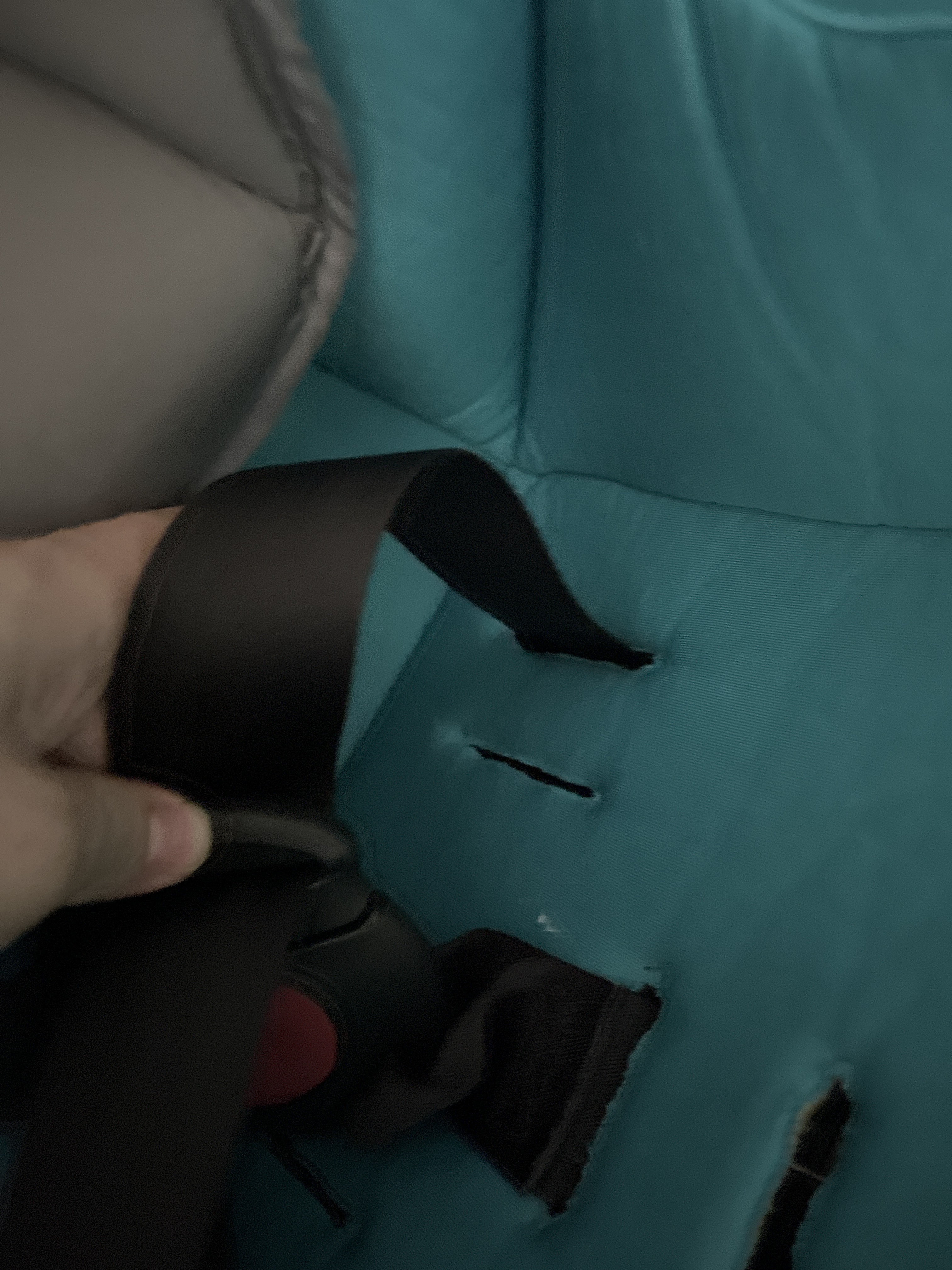 그 후에 양쪽으로 있는 긴 벨트를 파란색 시트 엉덩이 부분에서 구멍에서 빼 주세요.