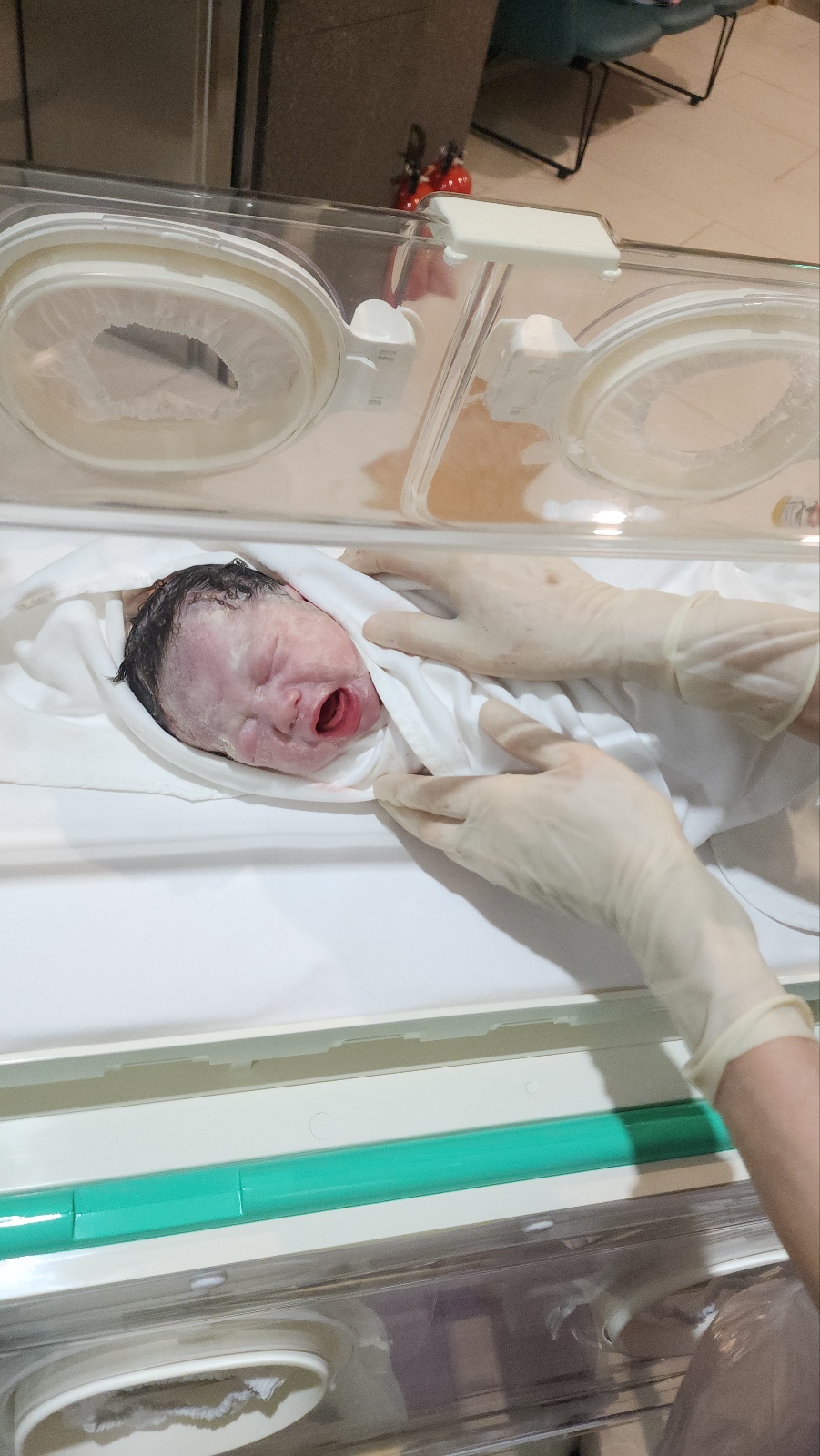 이때 밖에서 기다리고 있는 보호자에게 아이 손/발가락을 확인시켜 주시고 신생아실로 올라 가십니다.