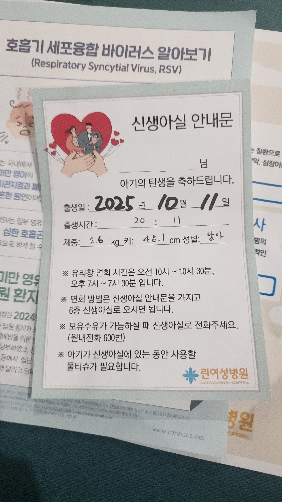 이때 보호자에게 신생아 검사관련 안내문과 신생아실 안내문을 줍니다.