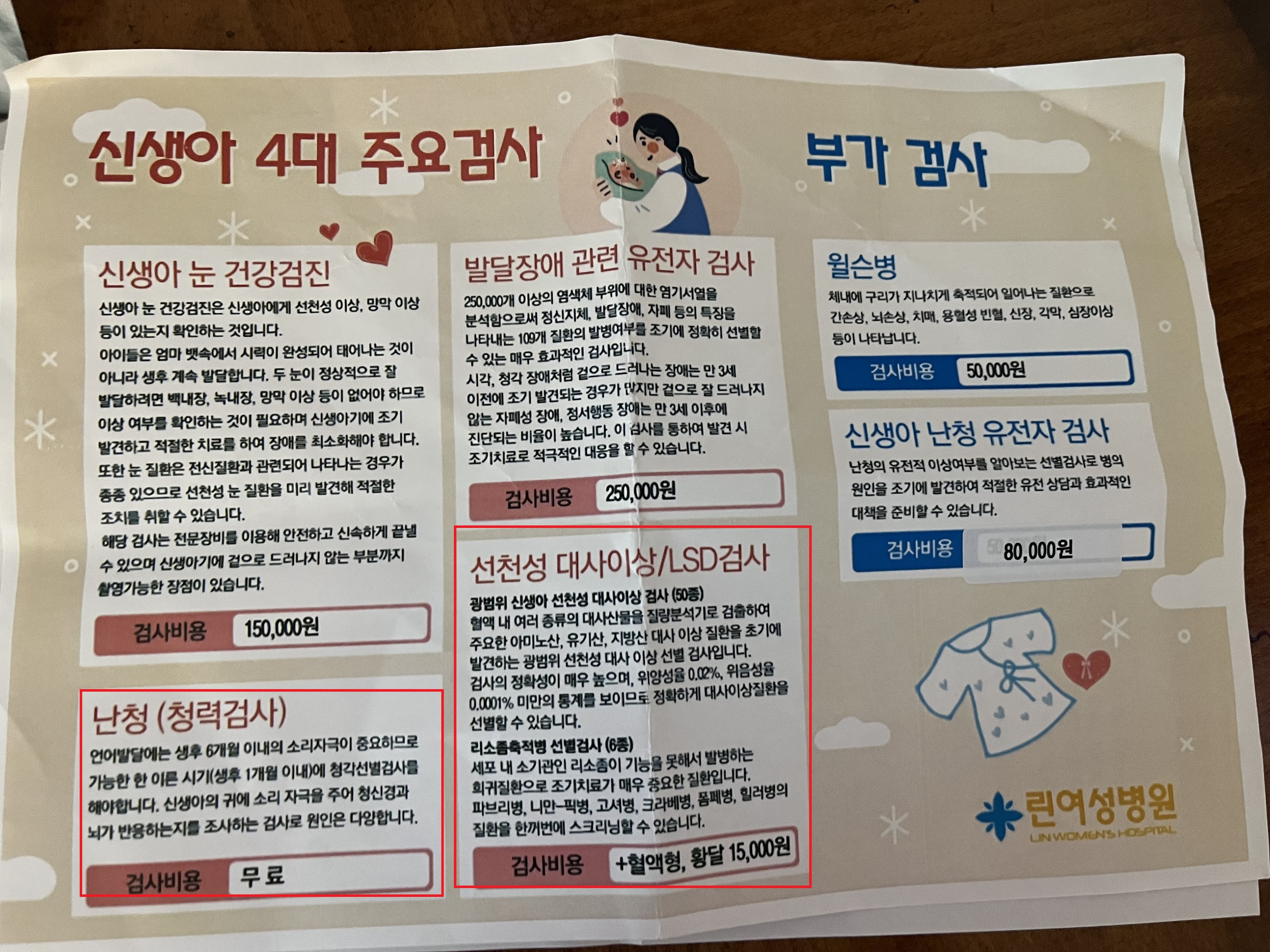 기본적인 검사는 제가 빨간 박스로 표시해 두었어요. 검사비용은 나중에 퇴원할 때 아기 검사비랑 신생아실 진료비 청구가 된답니다.