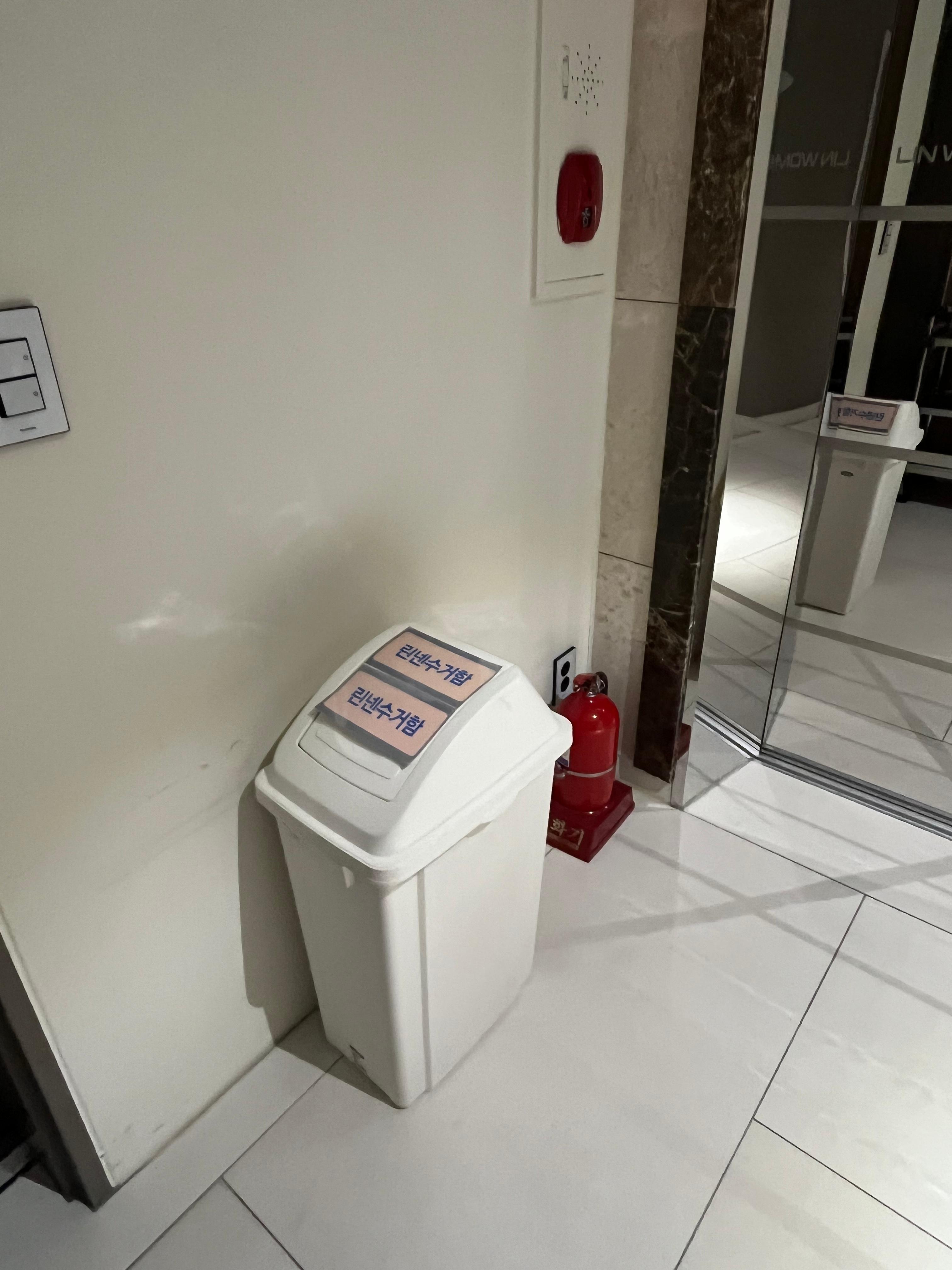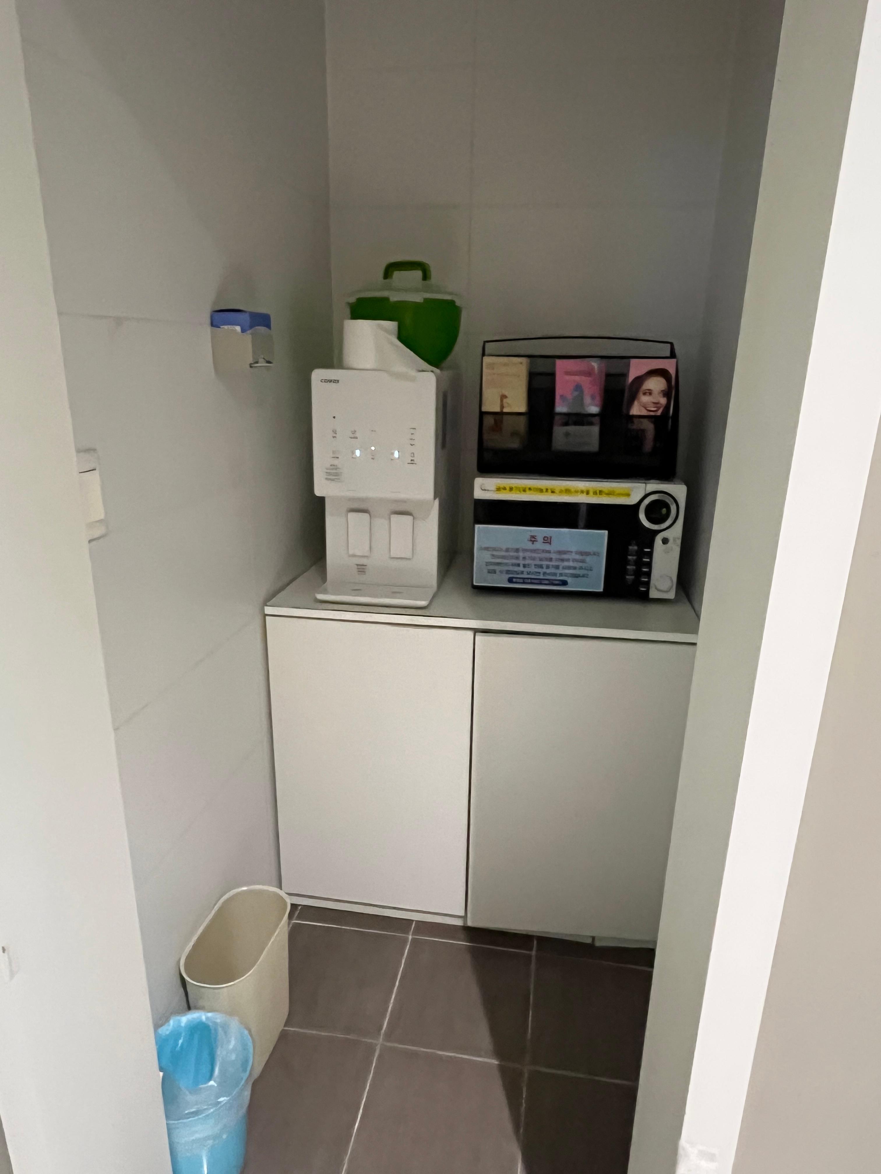 마지막으로 정수기, 전자레인지나 식판 반납하는 곳, 교체한 환자복을 넣는 바구니는 병실 밖에 있어서 여기를 이용하시면 돼요.
