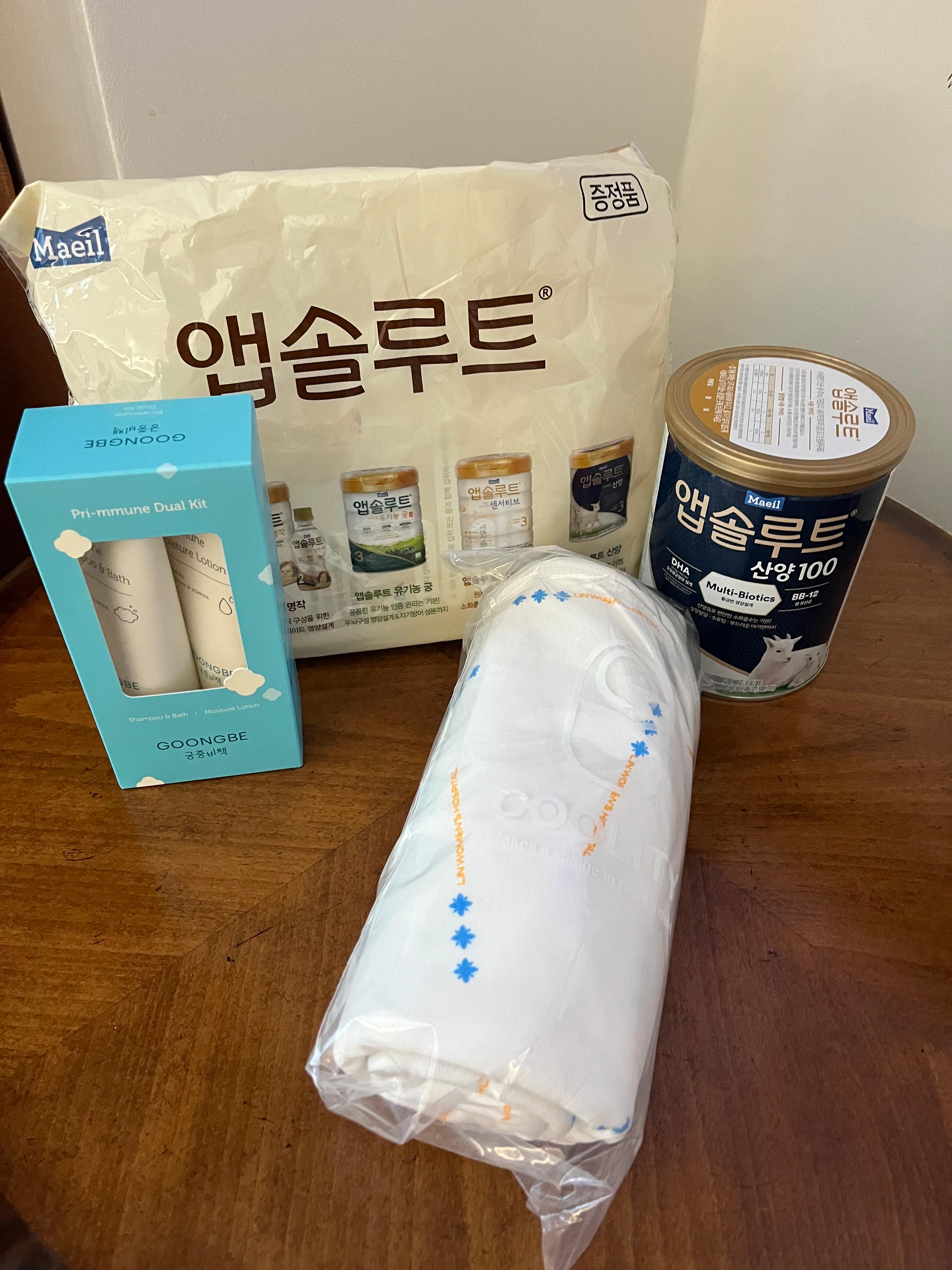 그 안에는 기본적으로 프로틴 / 앱솔루트 분유 / 아기 속싸개가 들어 있어요.