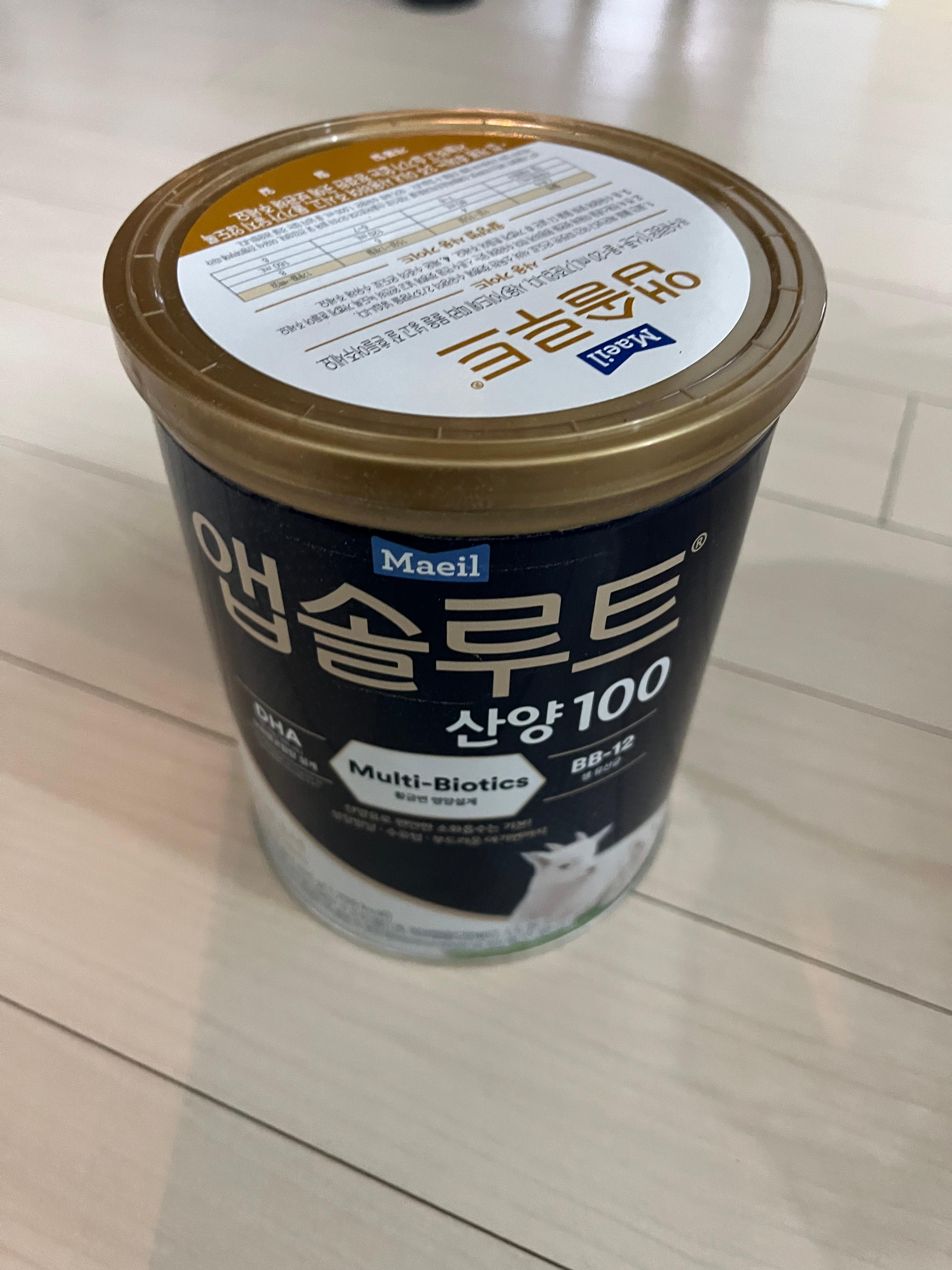 그런데 "앱솔루트에서 산양 100"이라는 100일까지 먹이는 분유가 있길래 저는 조리원에서 돌아와서는 산양 100으로 먹이게 되었는데요.